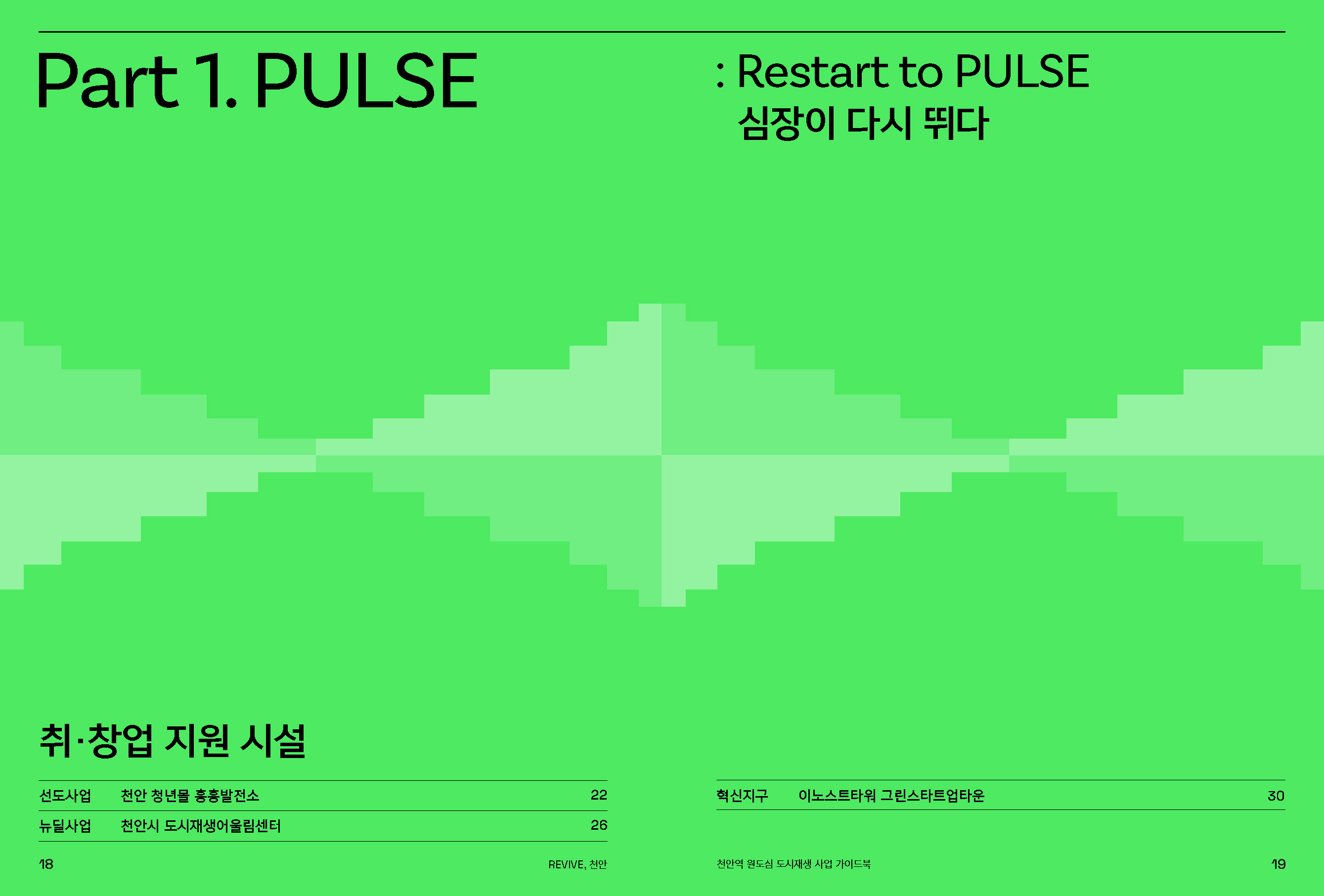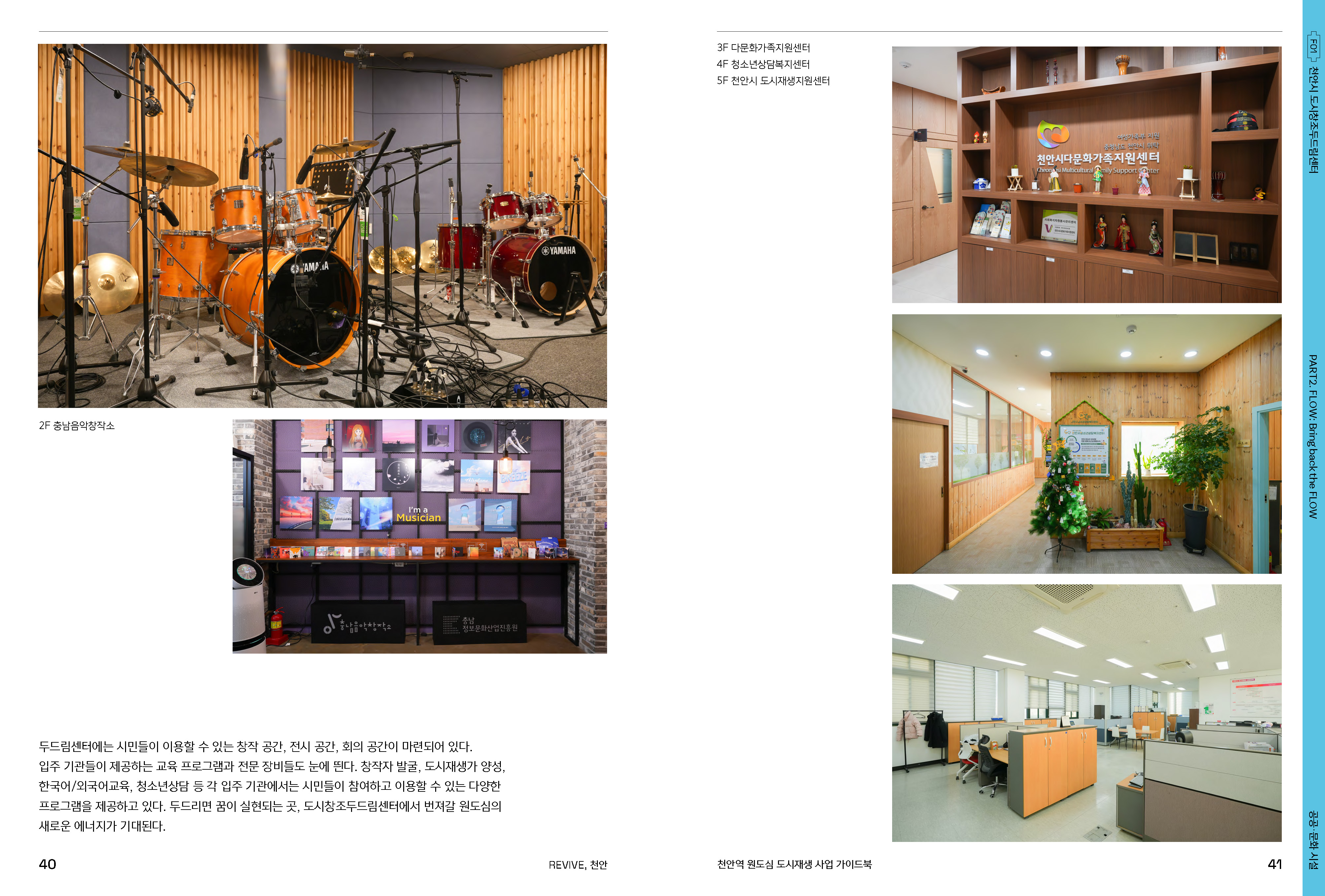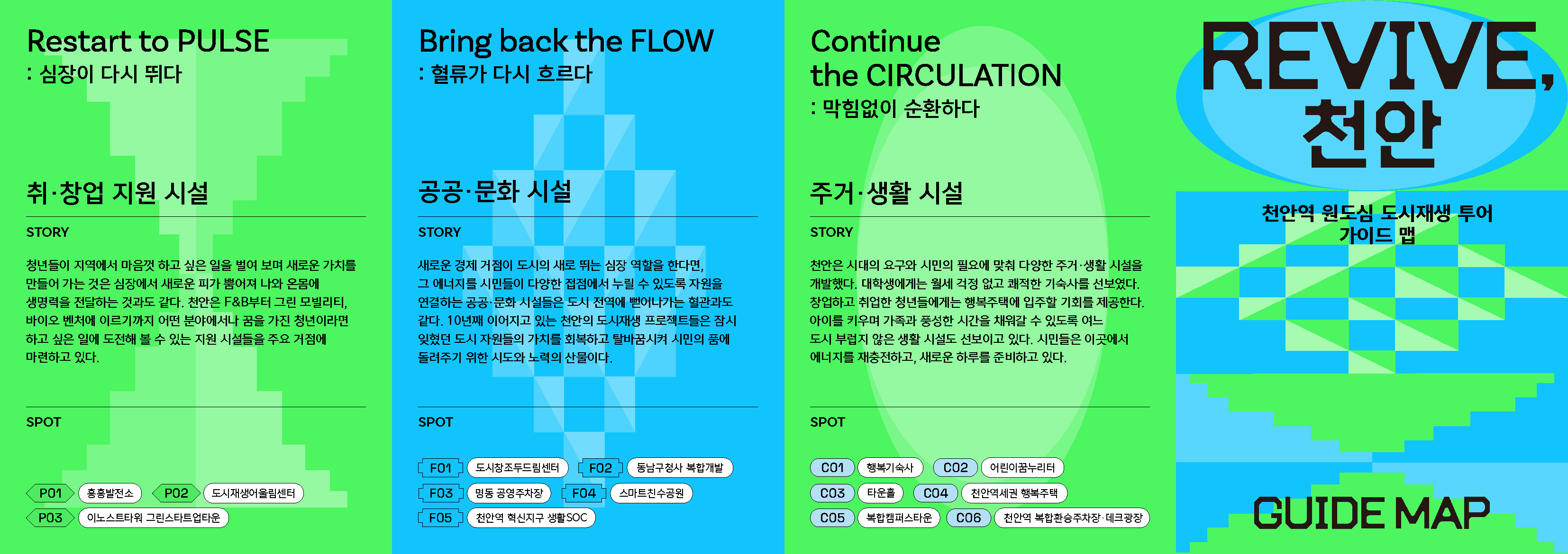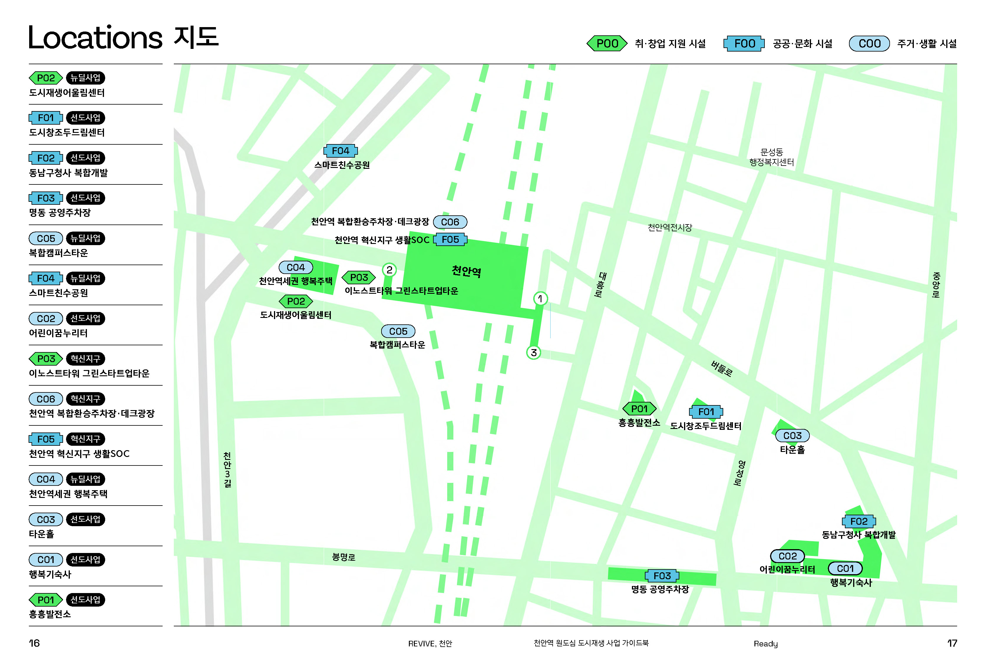 리바이브 천안 가이드북은 천안의 도시재생 사업을 소개하는 책입니다. 릿톤 스튜디오는 가이드북 기획, 원고 제작, 디자인 및 제작을 진행했습니다. 도시재생 사업의 역사를 시간대별로 정리하고, 취창업 시설, 공공문화시설, 주거생활시설로 나누어 소개하였습니다. 가이드북과 더불어, 천안의 도시재생 공간을 투어 형식으로 체험해볼 수 있도록 리플릿형 지도를 같이 제작했습니다.