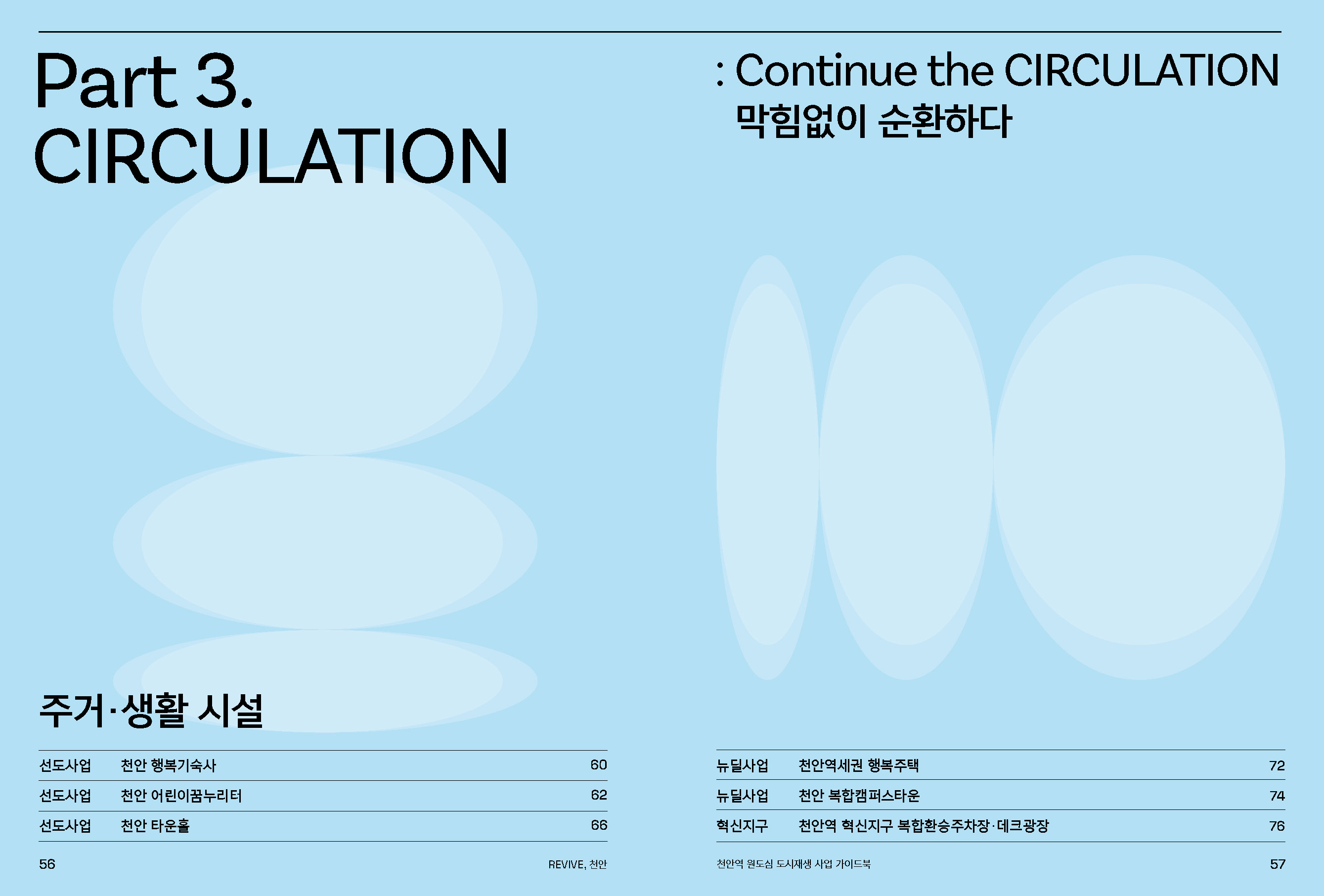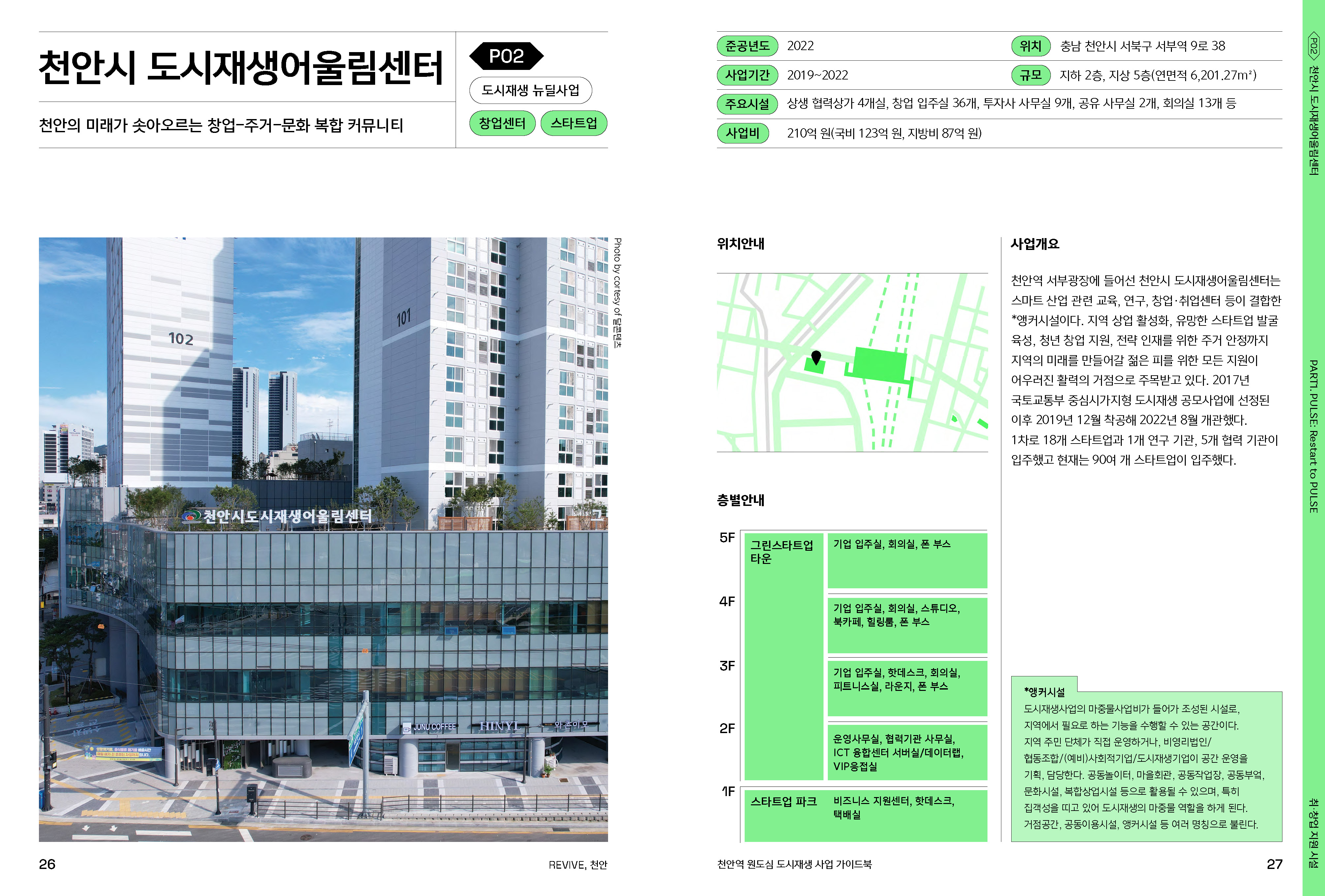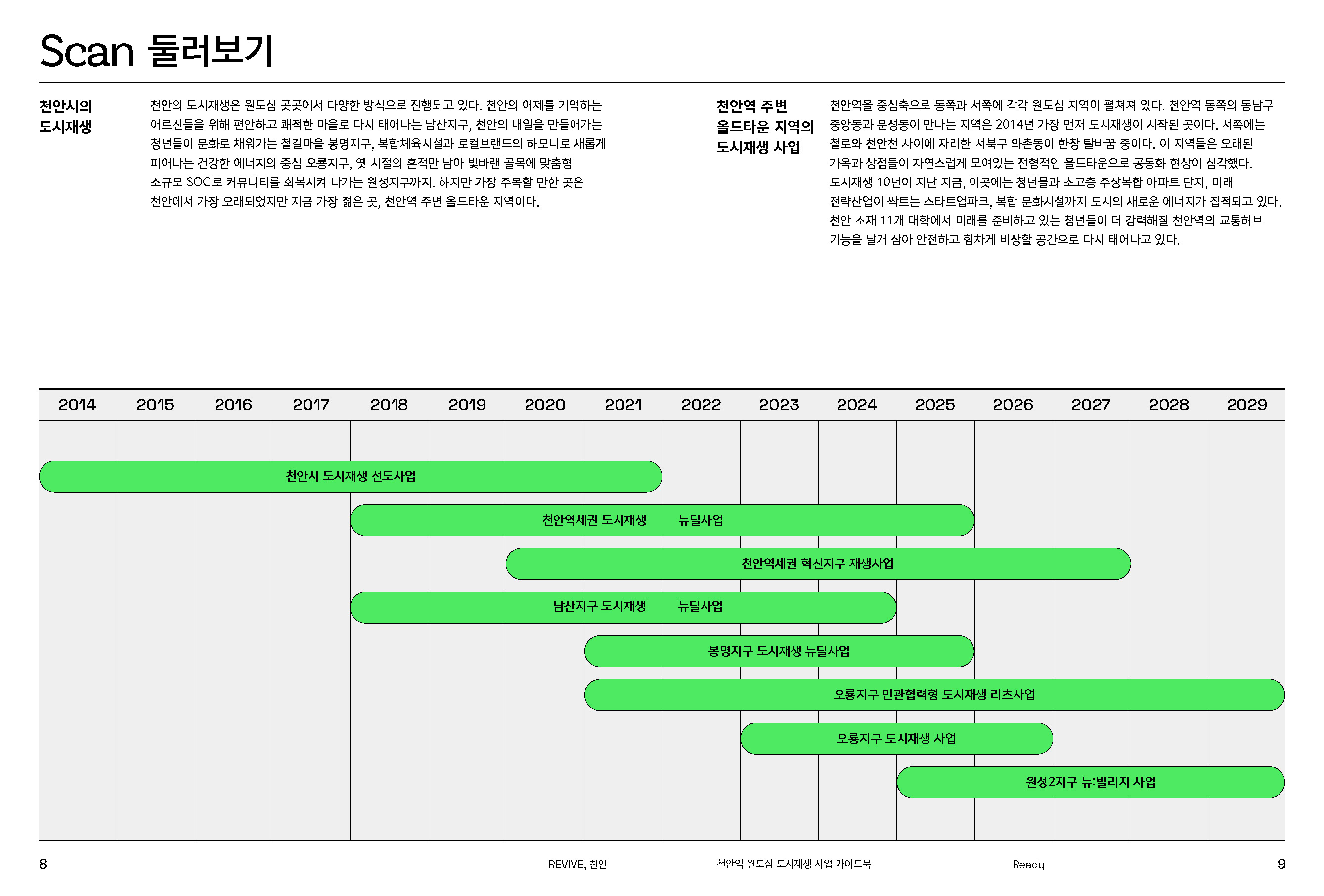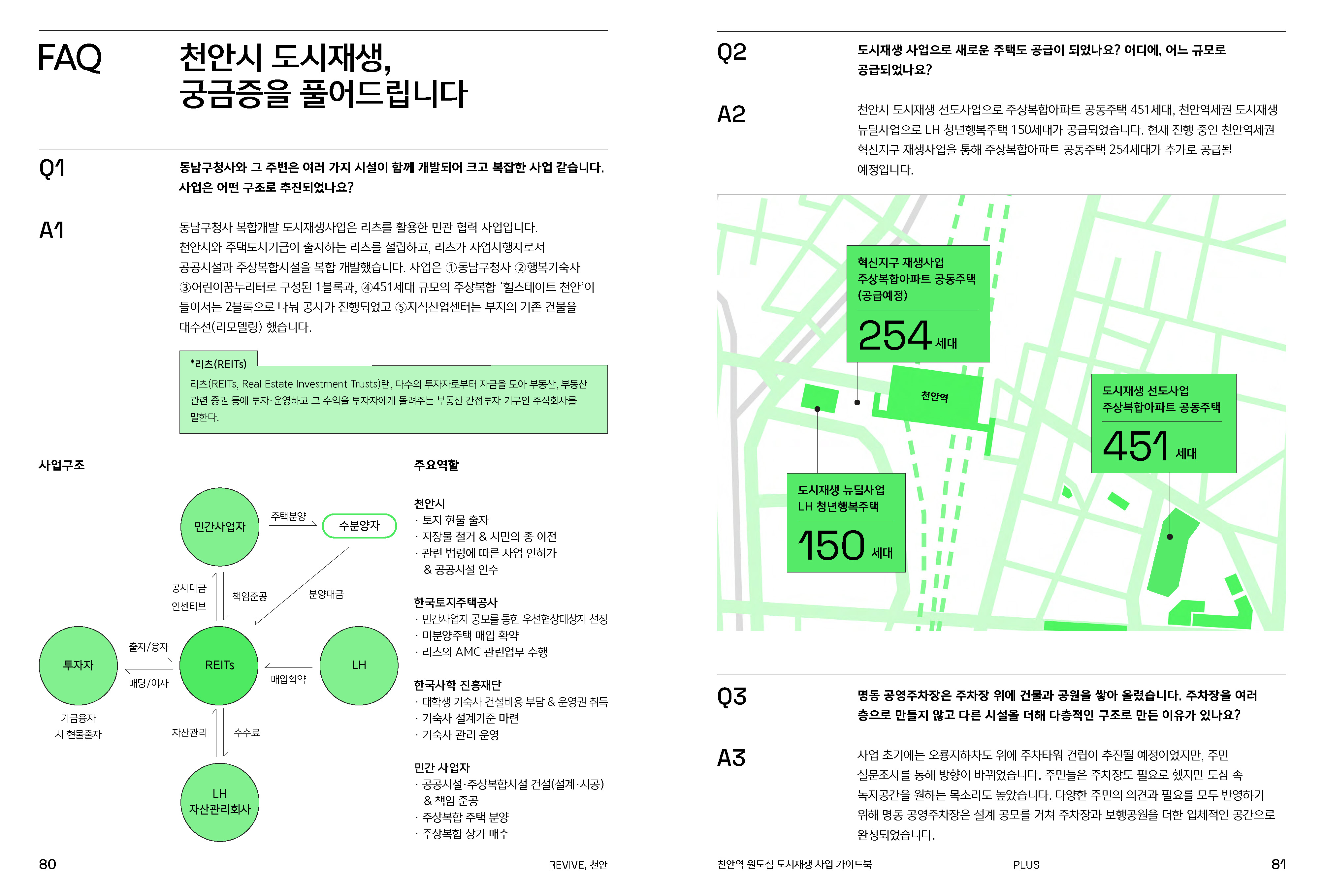 리바이브 천안 가이드북은 천안의 도시재생 사업을 소개하는 책입니다. 릿톤 스튜디오는 가이드북 기획, 원고 제작, 디자인 및 제작을 진행했습니다. 도시재생 사업의 역사를 시간대별로 정리하고, 취창업 시설, 공공문화시설, 주거생활시설로 나누어 소개하였습니다. 가이드북과 더불어, 천안의 도시재생 공간을 투어 형식으로 체험해볼 수 있도록 리플릿형 지도를 같이 제작했습니다.