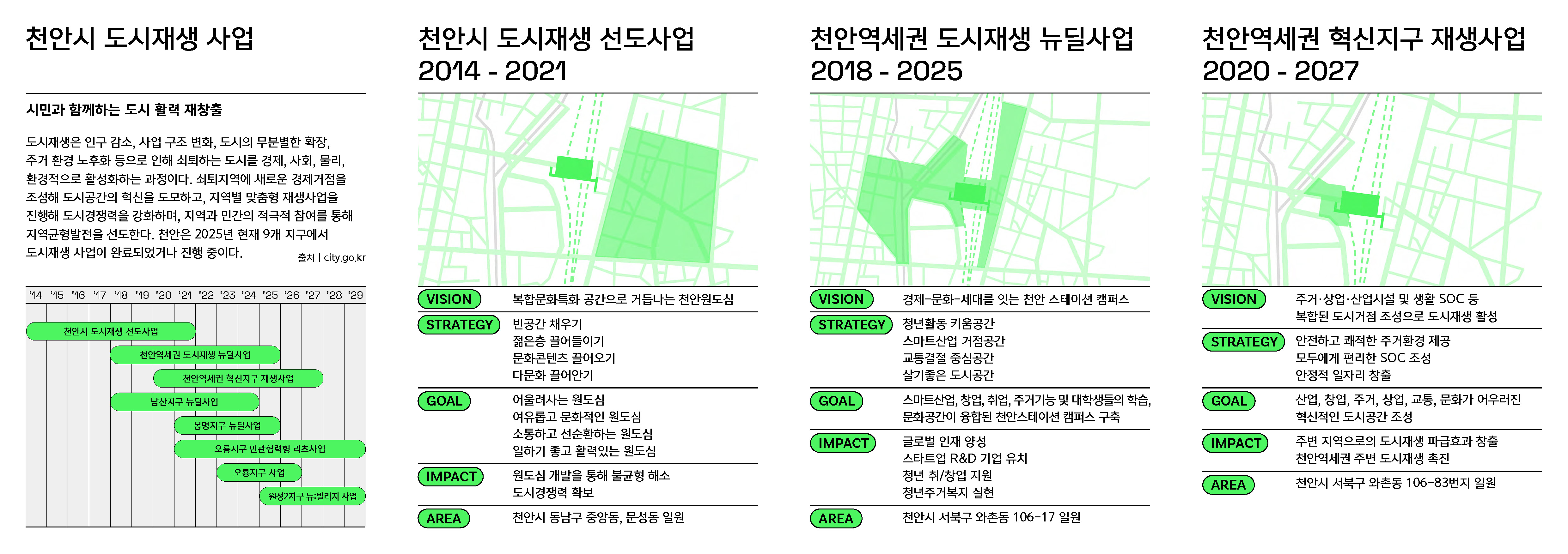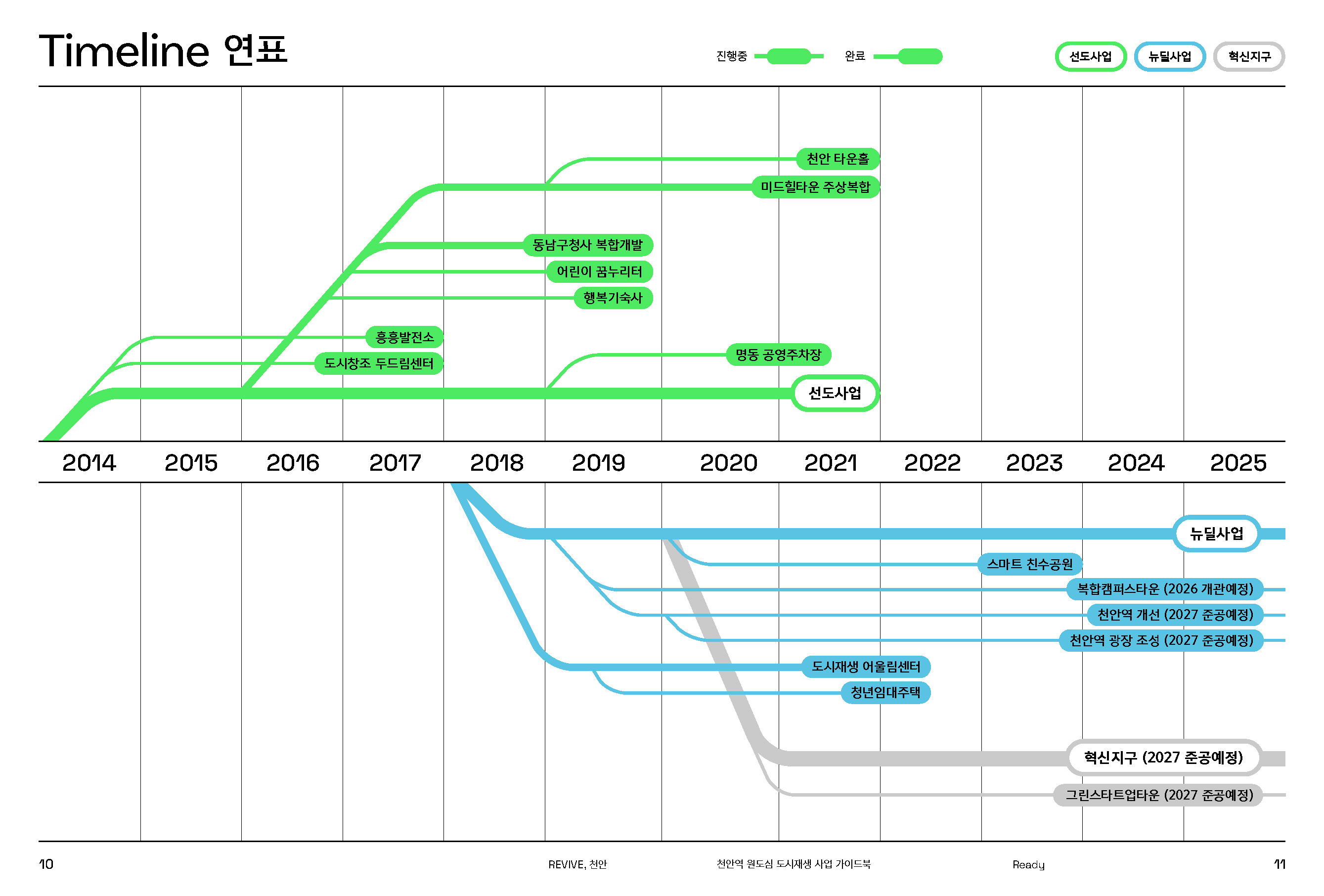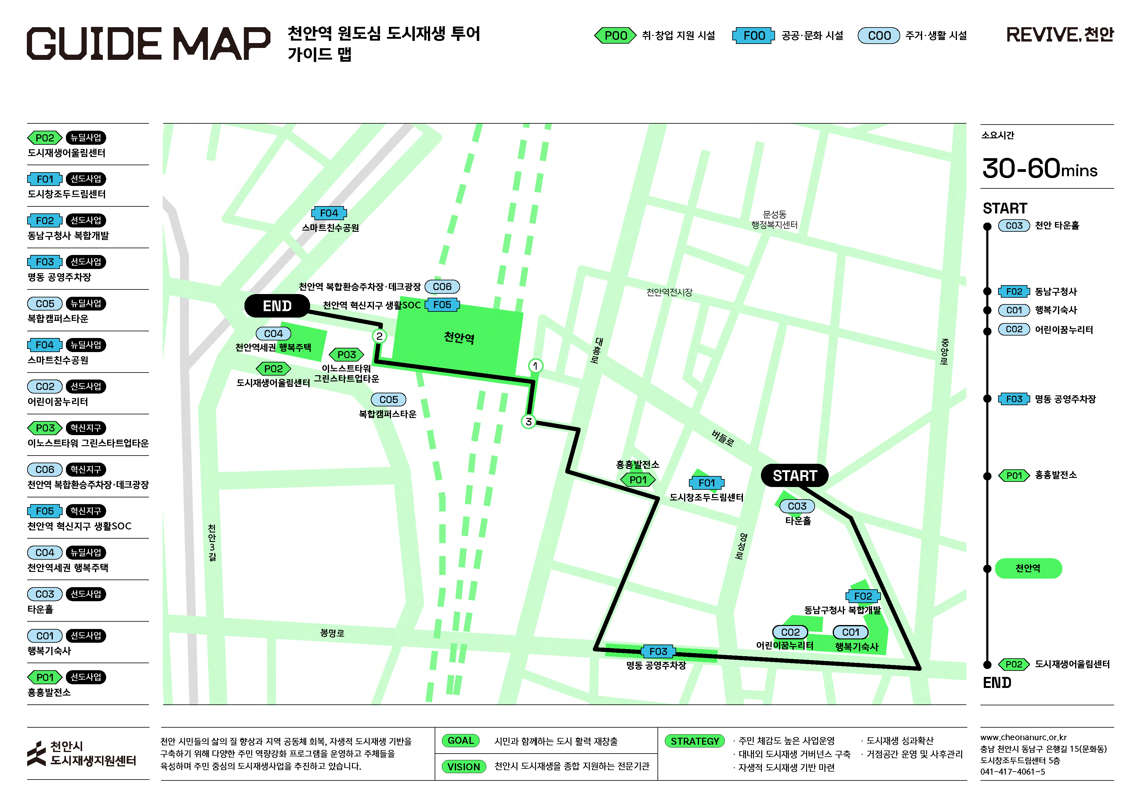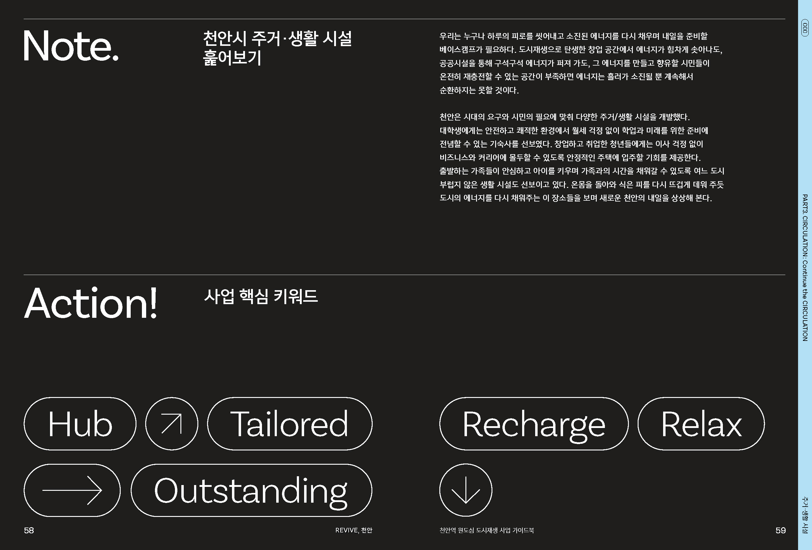 리바이브 천안 가이드북은 천안의 도시재생 사업을 소개하는 책입니다. 릿톤 스튜디오는 가이드북 기획, 원고 제작, 디자인 및 제작을 진행했습니다. 도시재생 사업의 역사를 시간대별로 정리하고, 취창업 시설, 공공문화시설, 주거생활시설로 나누어 소개하였습니다. 가이드북과 더불어, 천안의 도시재생 공간을 투어 형식으로 체험해볼 수 있도록 리플릿형 지도를 같이 제작했습니다.